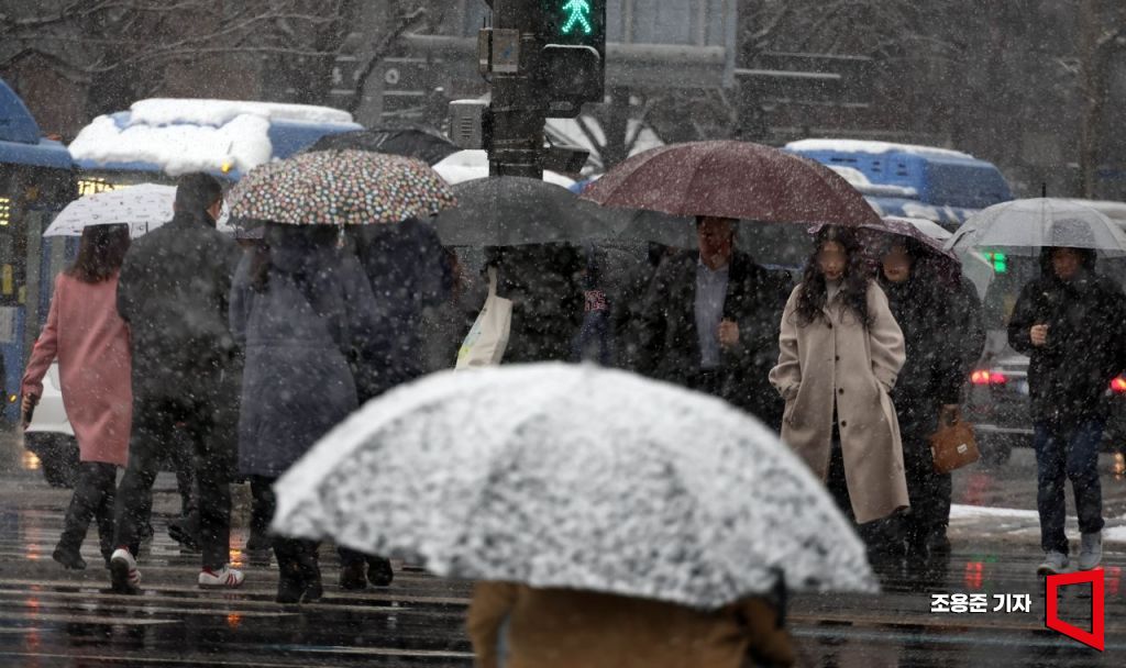 서울 역대 가장 늦은 대설특보가 발효된 18일 서울 종로구 광화문네거리에서 시민들이 눈을 맞으며 출근길을 서두르고 있다.