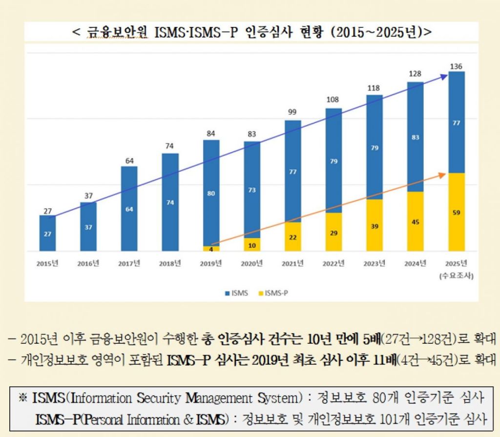 최근 금융당국의 자율보안체계 확립 기조에 따라 금융권의 디지털 신기술 도입과 활용은 유연해진 반면, 사고에 대한 책임은 강화돼 자율보안을 기반으로 하는 ISMS-P 인증제도의 중요성은 지속 증가할 것으로 전망된다. 실제 2015년 이후 금융보안원이 수행한 총 인증심사 건수는 27건에서 128건으로 확대됐다. 이 중 개인정보보호 영역이 포함된 ISMS-P 심사는 2019년 최초 심사 이후 11배(4건→45건)로 늘었다.