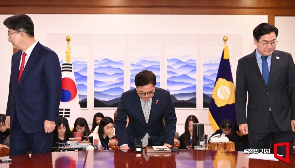 우원식 국회의장이 18일 국회에서 여야 원내대표와 회동하고 있다. 왼쪽부터 권성동 국민의힘 원내대표, 우 의장, 박찬대 더불어민주당 원내대표.