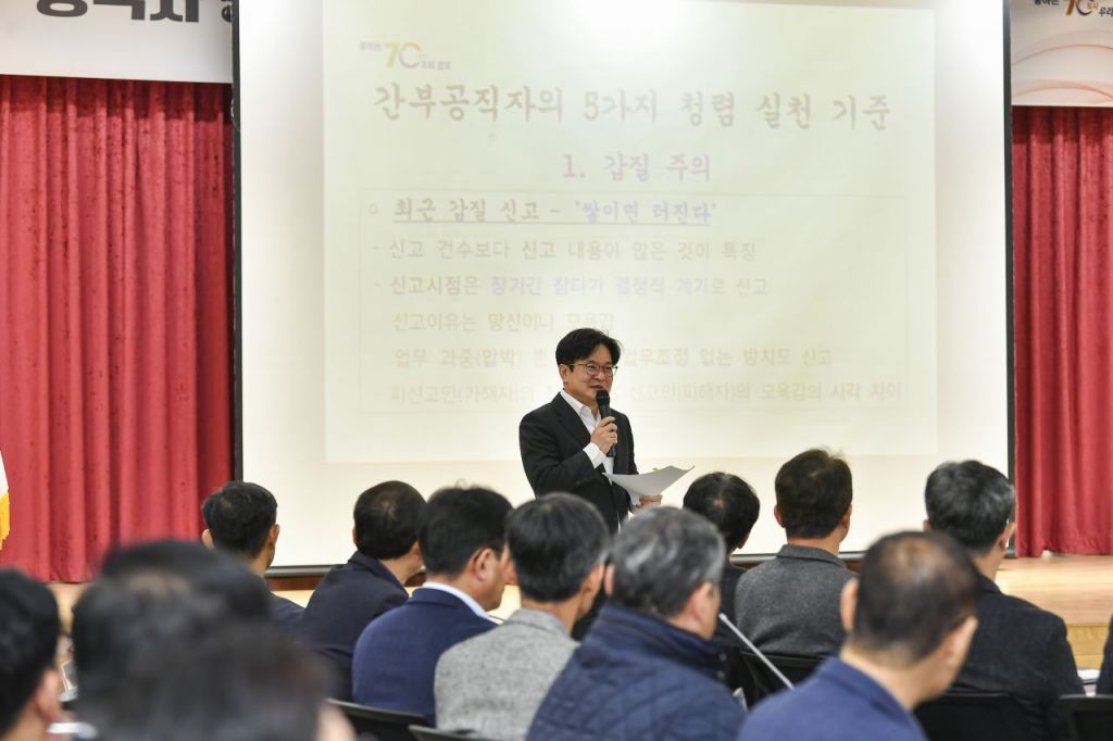 이어 김병수 시장은 ‘청렴리더십을 위한 간부공직자의 5가지 실천 기준’을 주제로 간부공무원 청렴교육을 진행했다. 특히 그는 “내가 바로 서면 후배도 바로 선다”며 ‘나부터 청렴한 자세’를 갖추는 청렴 리더십을 강조했다. 이어 ▲ 상대방을 존중하는 말과 표정으로 대하기 ▲ 성 비위 및 음주운전의 각별한 경각심 등을 당부했다.