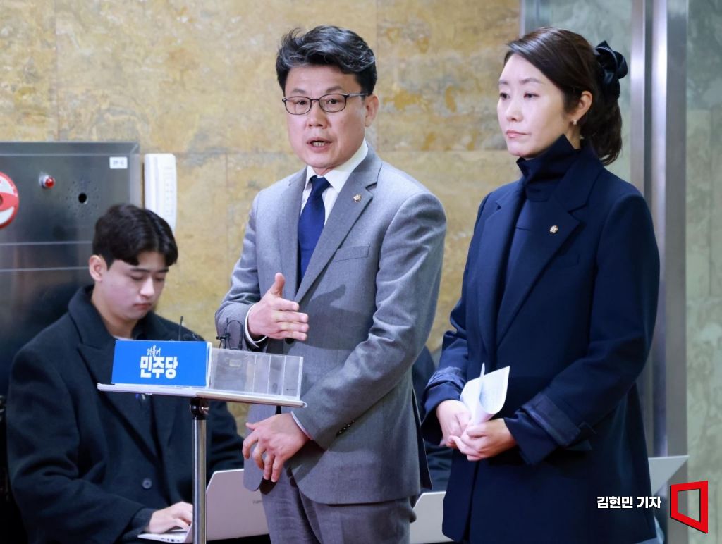 진성준 더불어민주당 정책위의장과 강선우 보건복지위원회 간사가 18일 국회에서 연금개혁특별위원회의 여야 논의 과정 등 진행상황을 백브리핑을 통해 설명하고 있다.