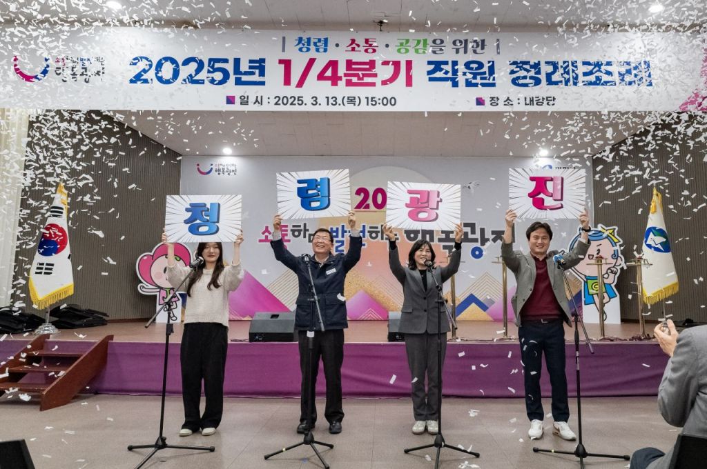 광진구(구청장 김경호)가 지난 13일 광진구청 대강당에서 1분기 직원 정례조례를 열고 종합청렴도 3년 연속 1등급을 향한 힘찬 출발을 알렸다.