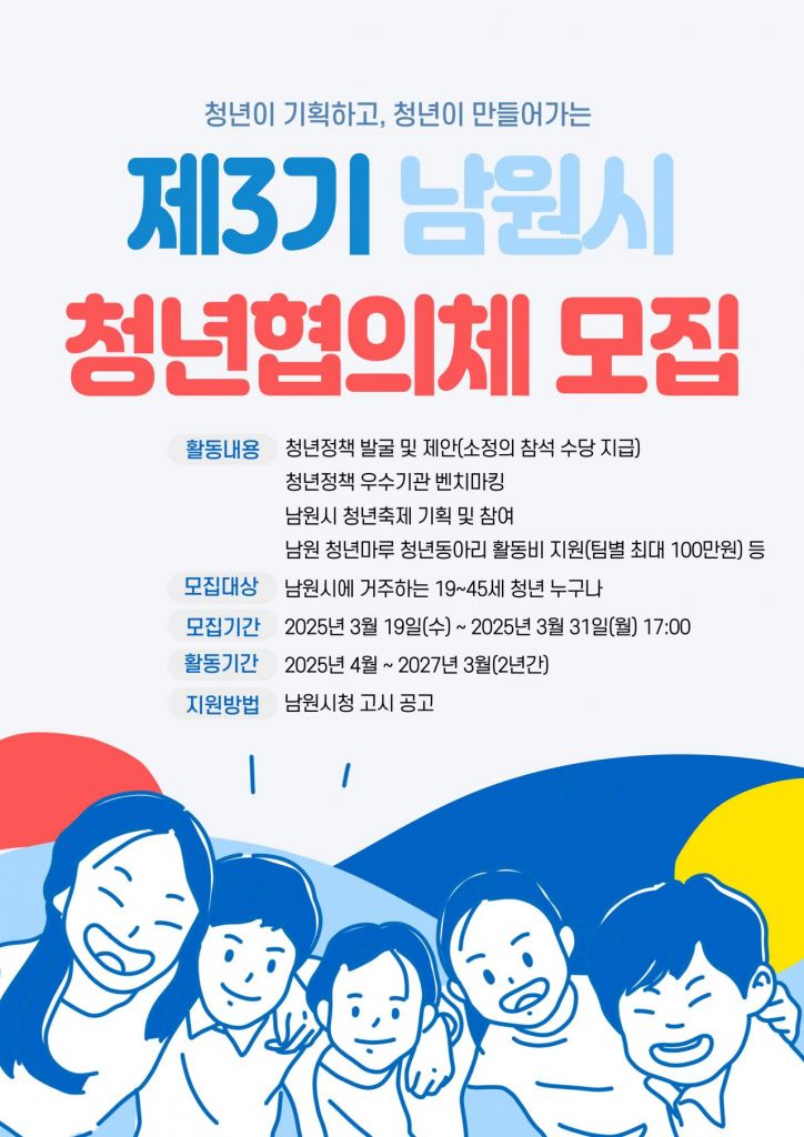 전북 남원시는 오는 31일까지 민선 8기 청년정책을 함께 할 제3기 청년협의체 위원을 모집한다고 19일 밝혔다.