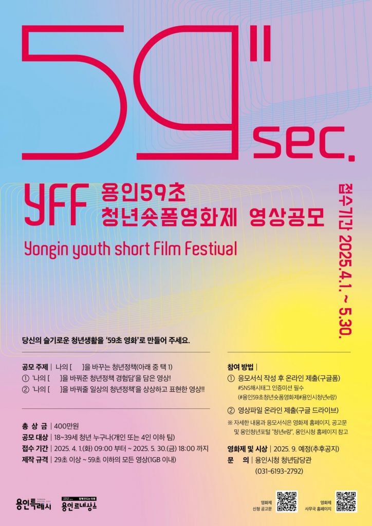 경기도 용인시는 다음 달 1일부터 5월30일까지 18~39세 청년을 대상으로 '용인 59초 청년 숏폼 영화제'에 참여할 영상을 공모한다.