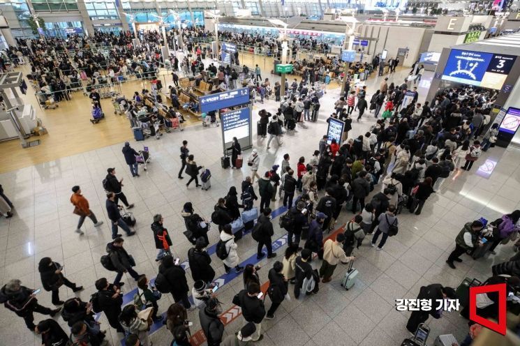 임시공휴일이 포함된 설 명절 연휴를 앞둔 지난 1월24일 인천국제공항 제1여객터미널을 찾은 여행객들이 탑승동으로 이동하기 위해 줄을 서고 있다.
