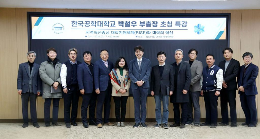 대진대학교가 지난 17일 지역혁신 중심 대학지원체계(RISE)의 성공적인 추진을 위한 전략적 방향을 모색하고자 한국공학대학교 박철우 부총장을 초청해 ‘RISE와 대학혁신’을 주제로 특강을 진행한 후 기념촬영을 하고 있다. 대진대학교 제공
