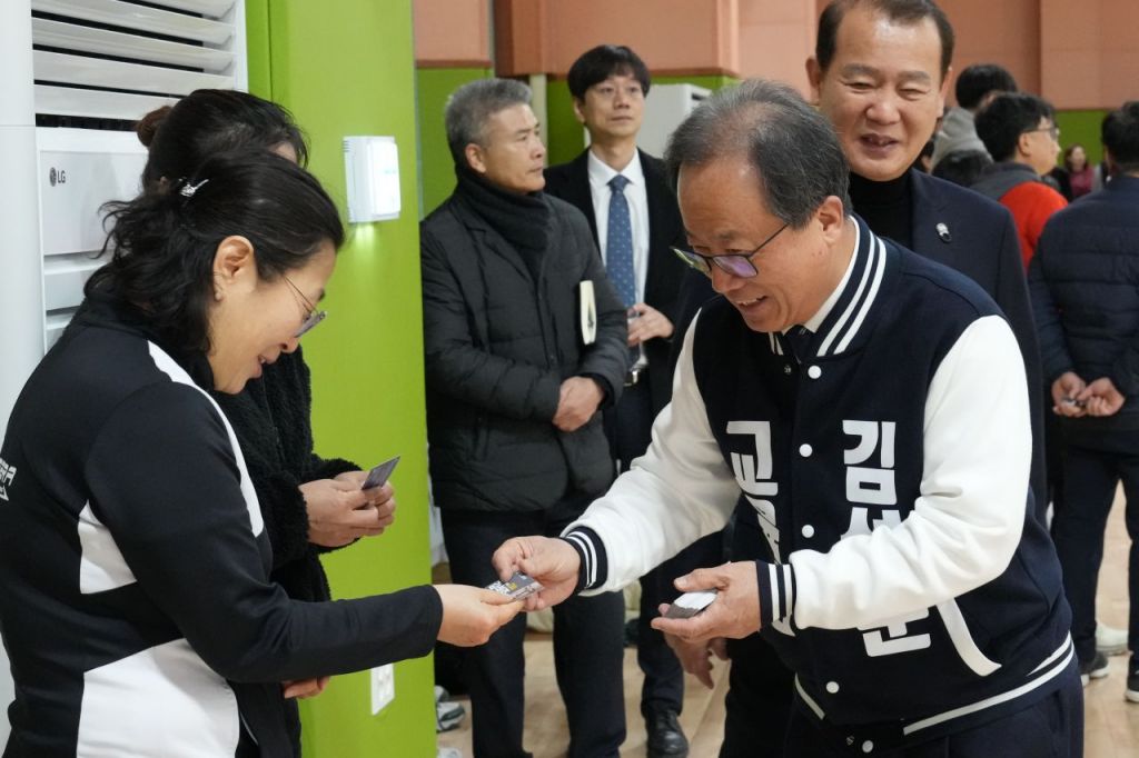 김석준 부산교육감 재선거 후보가 배드민턴 클럽 회원들에게 명함을 전하고 있다.
