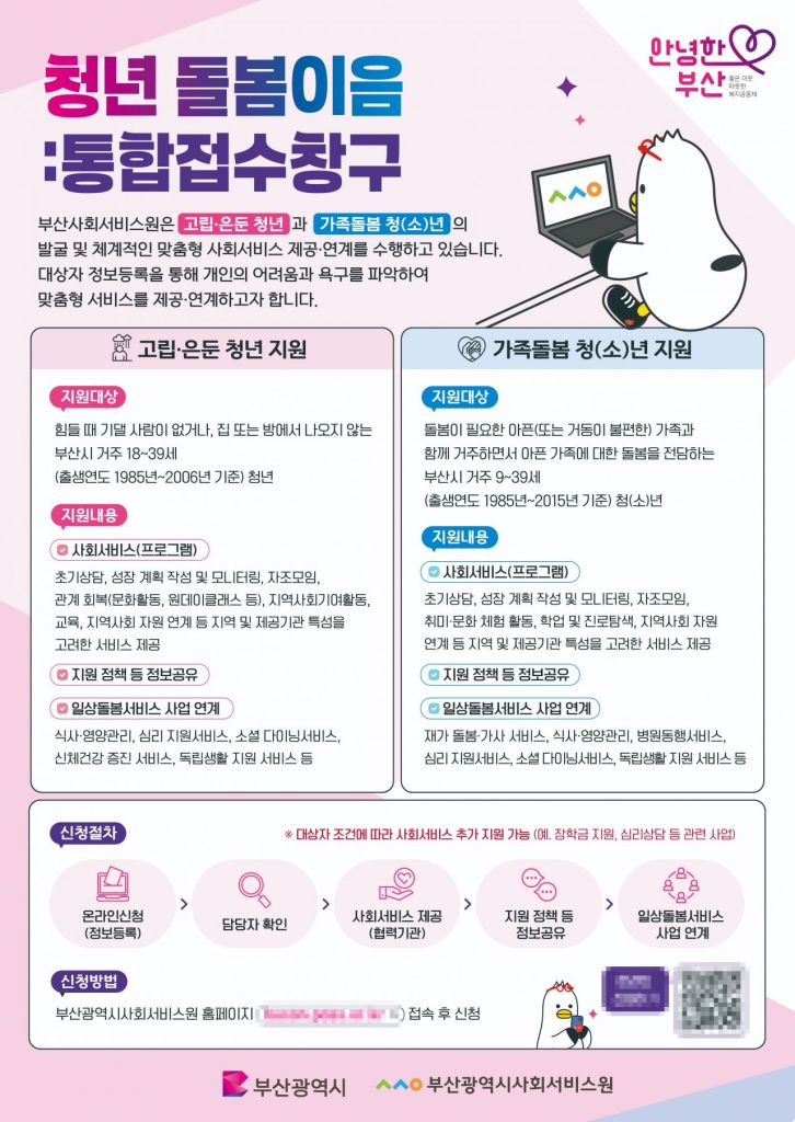 부산시 사회서비스원(원장 유규원)은 부산시(시장 박형준)와 함께, 부산의 고립·은둔 청년과 가족돌봄 청(소)년 대상으로 '맞춤형 사회서비스 제공과 연계 지원을 위한 청년 돌봄이음 사업'을 실시하고 체계적인 대상자 발굴·서비스 신청 등을 위한 통합접수창구를 지역 내 최초 개설·상시 운영한다.