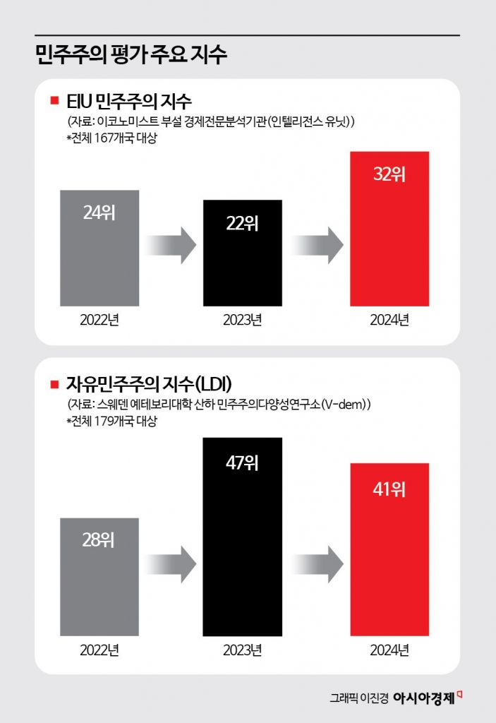 영국 이코노미스트 부설 경제전문분석기관(EIU·Economist Intelligence Unit)은 '2024 민주주의 지수' 발표를 통해 한국의 민주주의가 퇴보하고 있다는 평가를 내렸다. EIU 지수에서 한국은 총점 10점 만점 중 7.75점을 기록, 2006년 지수 산출 이래 가장 낮은 점수를 받았다. 순위도 22위(8.09점)를 기록했던 2023년보다 열 계단 하락한 32위를 기록했다. 이로 인해 한국은 8점 이상 국가가 속하는 '완전한(full) 민주주의'가 아닌 '결함 있는(flawed) 민주주의'에 속하게 됐다.