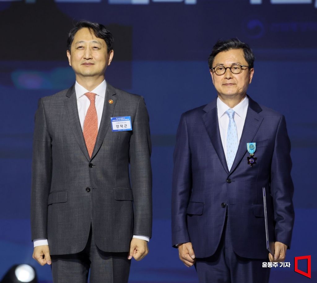 조익성 동아오츠카 부회장이 19일 서울 중구 대한상의에서 열린 '52회 상공의날 기념식'에서 철탑산업훈장을 수상 후 안덕근 산업부 장관과 기념촬영을 하고 있다.