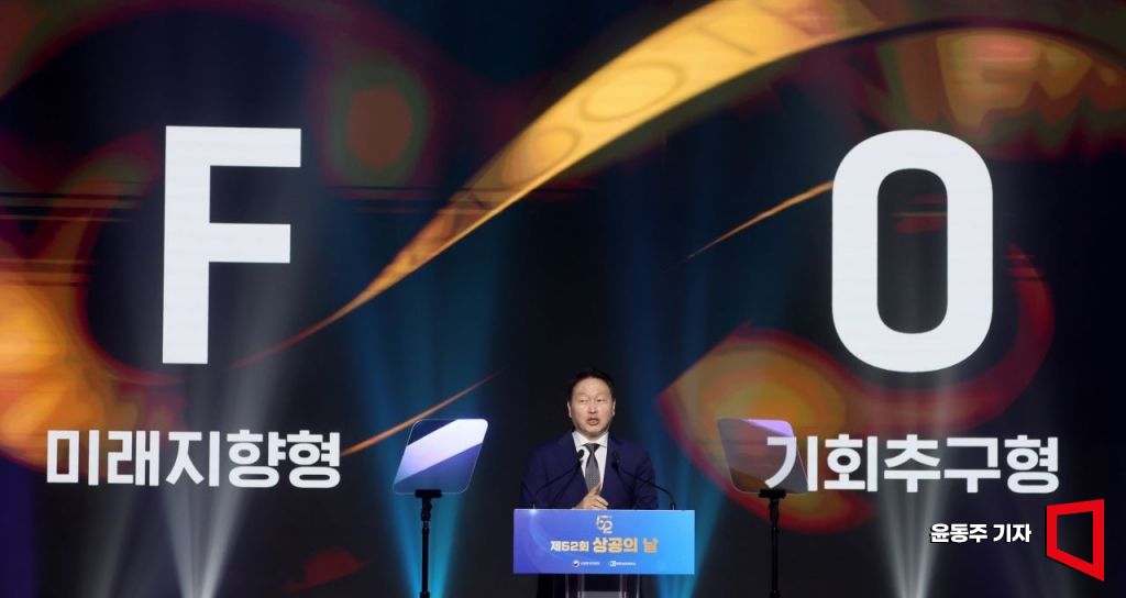 최태원 대한상의 회장이 19일 서울 중구 대한상의에서 열린 '52회 상공의날 기념식'에서 기념사를 하고 있다.