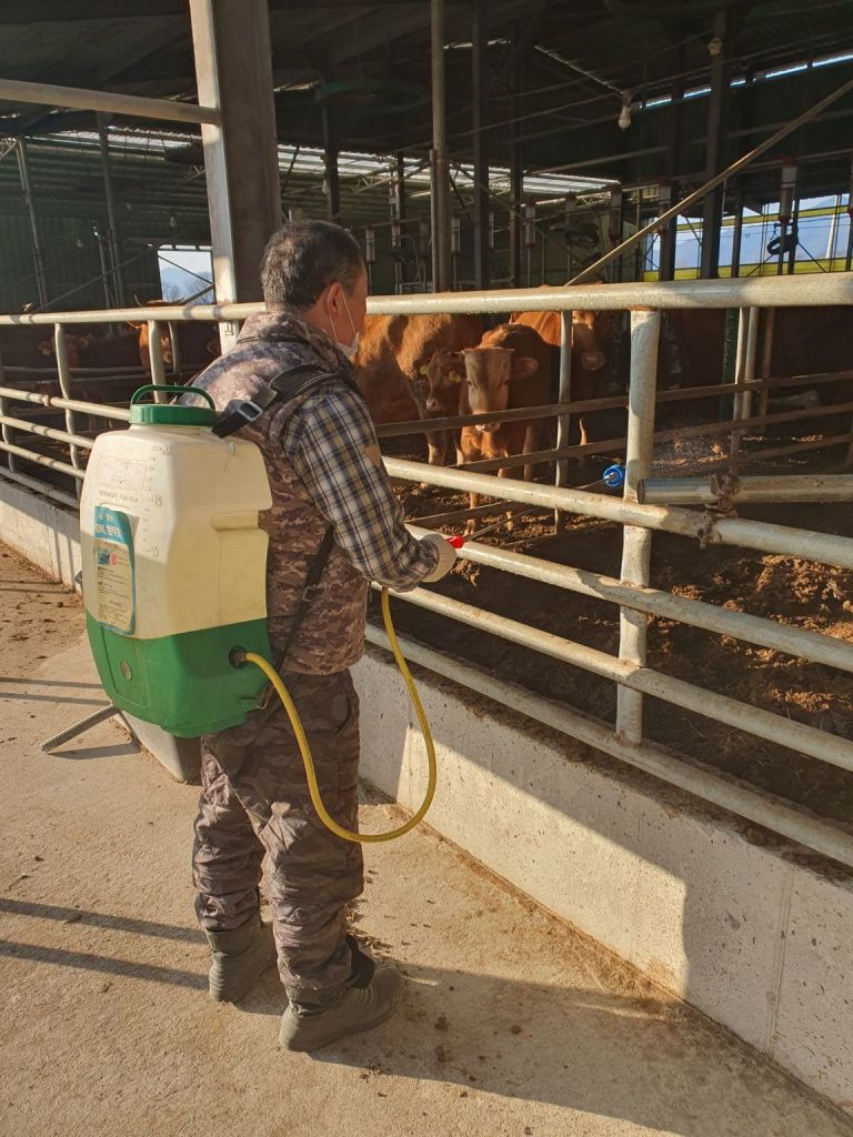전남 한 한우 축사에서 축주가 구제역 예방을 위한 소독 작업을 하고 있는 모습. 전남도 제공