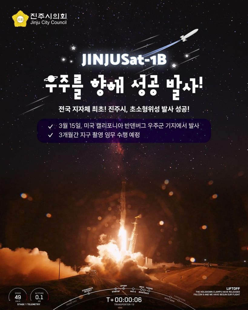 진주시는 2023년 첫 초소형 인공위성 진주샛-1을 발사 실패의 아쉬움을 털어내고 2년 만에 재도전하면서 마침내 우주 개척에 이름을 올린 첫 지자체라는 기쁨을 누리게 됐다. 이번 인공위성은 앞으로 3개월간 카메라 3대로 경남 인근의 바다를 촬영하는 임무를 수행한다.