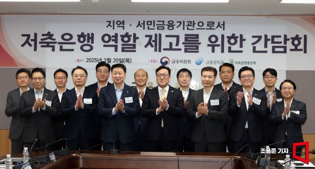 김병환 금융위원회 위원장을 비롯해 시중 저축은행 대표들이 20일 서울 종로 정부서울청사에서 열린 저축은행업권 간담회에 참석, 기념촬영을 하고 있다. 2025.3.20 조용준 기자
