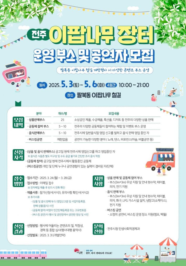 전북 전주시가 오는 5월 황금연휴 기간 팔복동 이팝나무 철길 일원에서 펼쳐지는 ‘전주 이팝나무 장터’에서 부스를 운영할 참여업체와 버스킹 공연단체를 공개 모집한다.