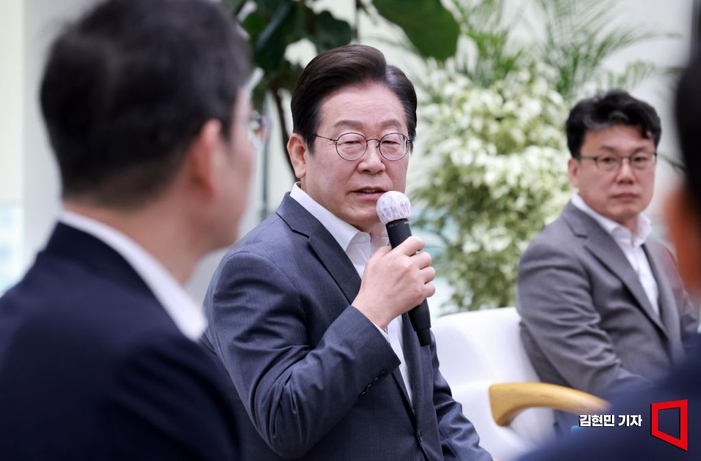이재명 더불어민주당 대표와 이재용 삼성전자 회장이 20일 서울 강남구 삼성 청년 소프트웨어 아카데미(SSAFY)에서 열린 ‘청년 취업 지원 현장 간담회'에 앞서 환담하고 있다.