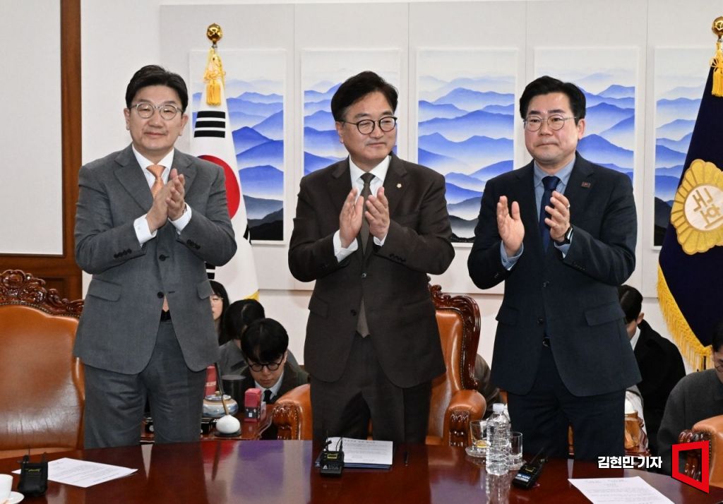 우원식 국회의장과 권성동 국민의힘 원내대표(왼쪽), 박찬대 더불어민주당 원내대표(오른쪽)가 20일 국회 의장실에서 국민연금 개혁안 합의문을 발표하고 있다.