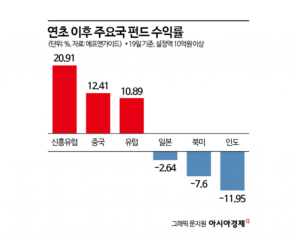 21일 금융정보업체 에프앤가이드에 따르면 주요 지역별 펀드 중 올들어 가장 높은 수익률을 기록한 곳은 신흥유럽 펀드였다. 신흥유럽 펀드는 연초 이후 20.91%의 수익률을 기록했다. 에프앤가이드가 분류하는 지역별 펀드 중 연초 이후 수익률이 20%를 넘은 곳은 신흥유럽 뿐이다. 유럽 펀드 수익률도 양호했다. 유럽 펀드는 연초 이후 10.89%의 수익률을 기록했다. 이밖에 중국(12.41%), 브라질(12.52%), 러시아(12.20) 펀드가 12%대 수익률을 나타냈다.