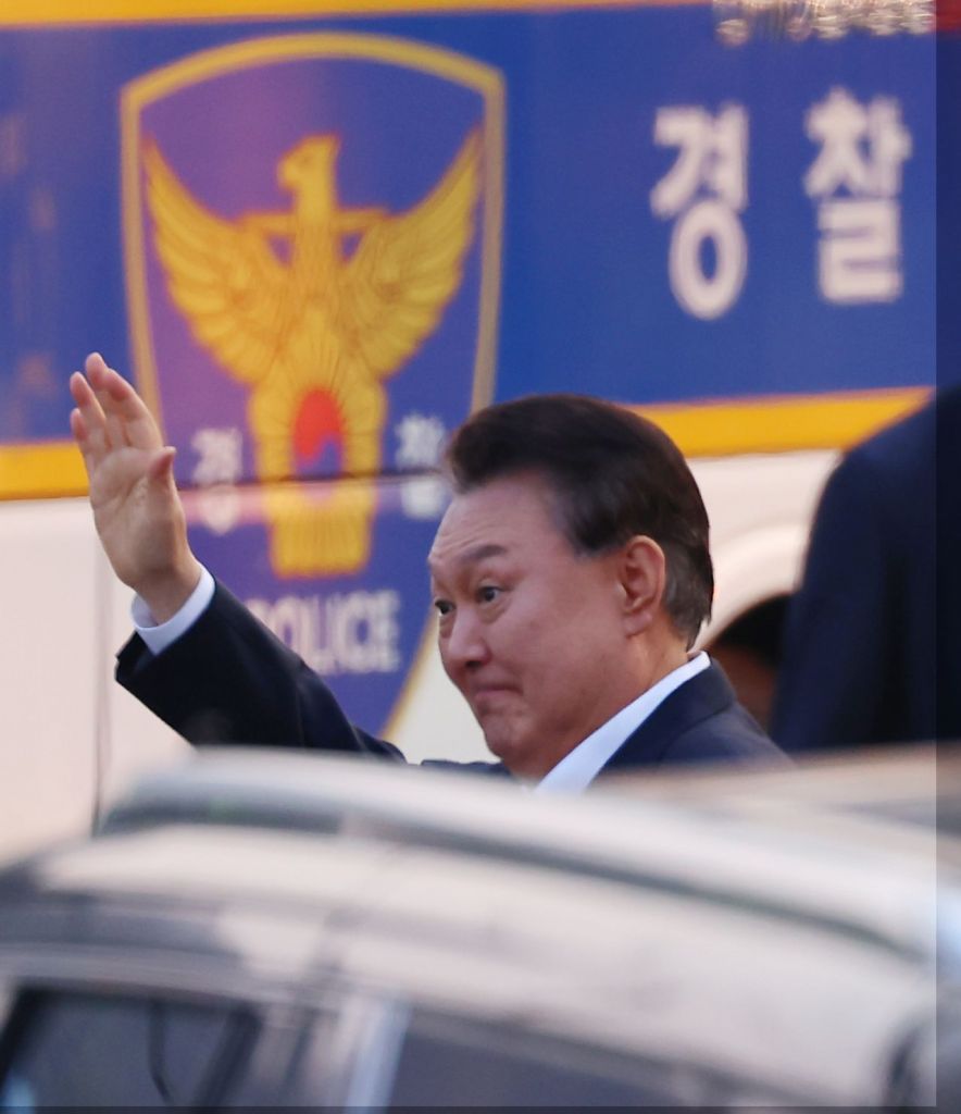 석방된 윤석열 대통령이 지난 8일 경기도 의왕시 서울구치소 앞에서 경호차량에서 내려 지지자들에게 인사하고 있다. 연합뉴스