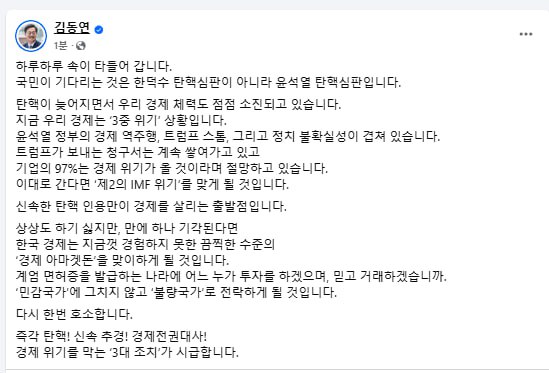 특히 "윤석열 정부의 경제 역주행, 트럼프 스톰, 그리고 정치 불확실성이 겹쳐 있다"며 "트럼프가 보내는 청구서는 계속 쌓여가고 있고 기업의 97%는 경제 위기가 올 것이라며 절망하고 있다"고 전했다.