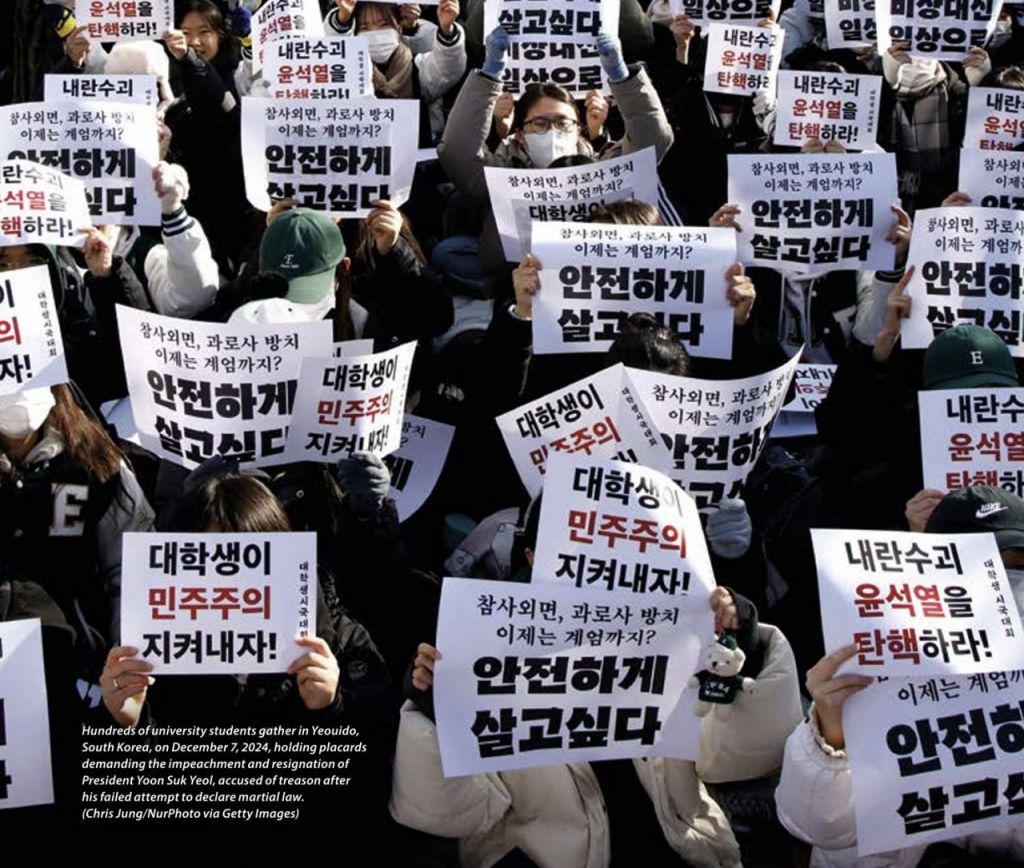 스웨덴 예테보리대 산하 민주주의다양성연구소(V-Dem)가 이달 발간한 보고서에서 낯익은 사진을 발견했다. 한글이 적힌 팻말을 들고 있는 수백 명의 대학생 시위대 사진은 2024년 12월7일 여의도 집회 현장에서 찍힌 것이었다.