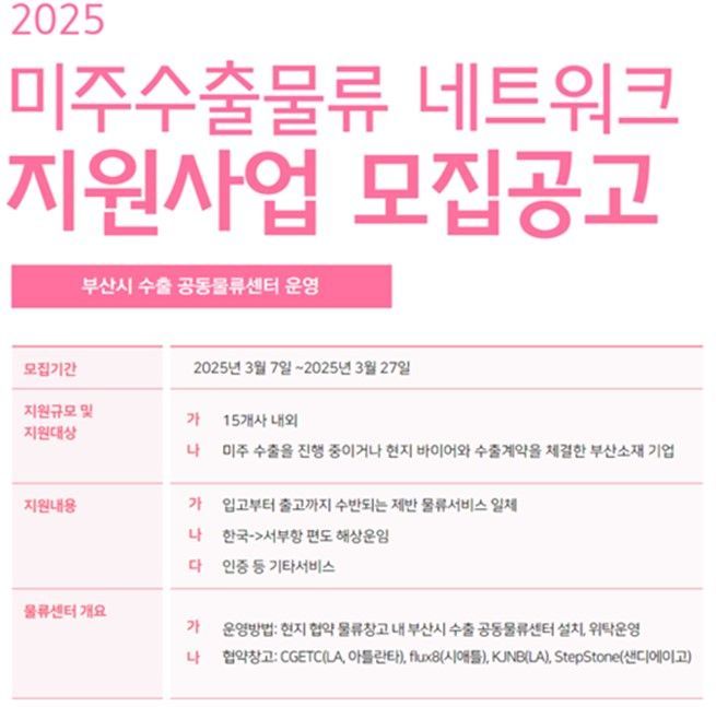 미주 수출 물류네트워크 지원 사업은 해외에 독자적으로 물류센터 구축이 어려운 부산 중소기업에 미주 현지 창고를 공동 사용할 기회를 제공하고 현지물류센터 인프라를 활용한 맞춤형 물류 서비스를 제공하는 프로젝트이다.
