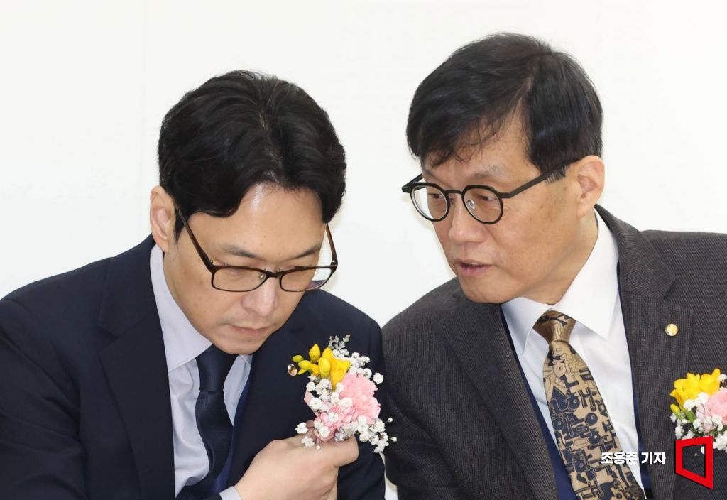 이창용 한국은행 총재(오른쪽)와 이재원 한국은행 경제연구원장이 21일 서울 연세대 대우관 각당헌에서 열린 인구와 인재 연구원 개원 컨퍼런스에 참석, 대화를 하고 있다.