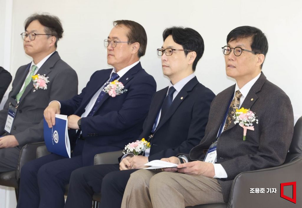이창용 한국은행 총재(오른쪽) 등 참석자들이 21일 서울 연세대 대우관 각당헌에서 열린 인구와 인재 연구원 개원 컨퍼런스에 참석, 개회를 기다리고 있다.