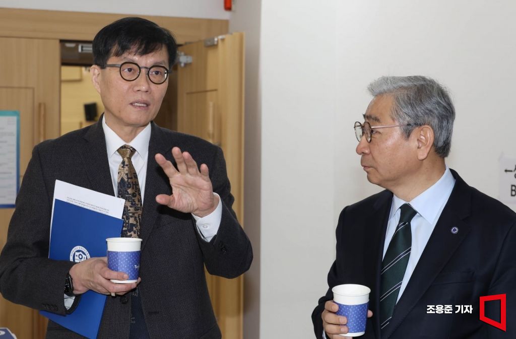 이창용 한국은행 총재(왼쪽), 윤동섭 연세대 총장이 21일 서울 연세대 대우관 각당헌에서 열린 인구와 인재 연구원 개원 컨퍼런스에 참석, 대화를하고 있다.