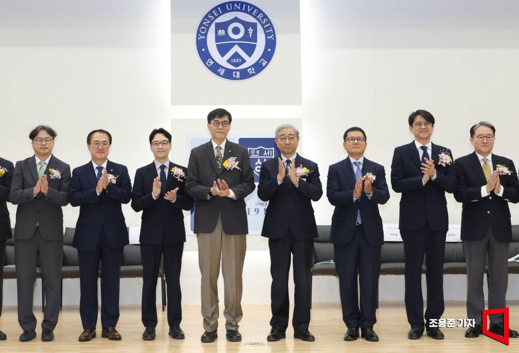 윤동섭 연세대 총장(오른쪽 네번째), 이창용 한국은행 총재(왼쪽 네번째) 등 참석자들이 21일 서울 연세대 대우관 각당헌에서 열린 인구와 인재 연구원 개원 컨퍼런스에 참석, 기념촬영을 하고 있다.