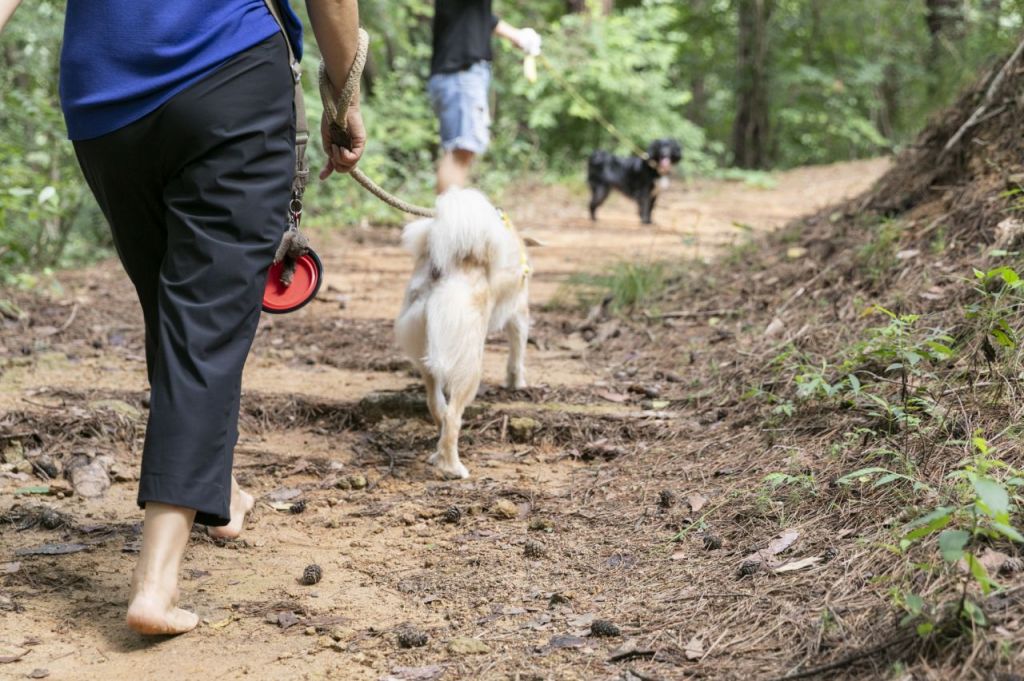 지난해 반려동행 숲 치유 프로그램에 참여한 반려인과 반려동물이 맨발걷기 체험을 하고 있다. 한국산림복지진흥원 제공