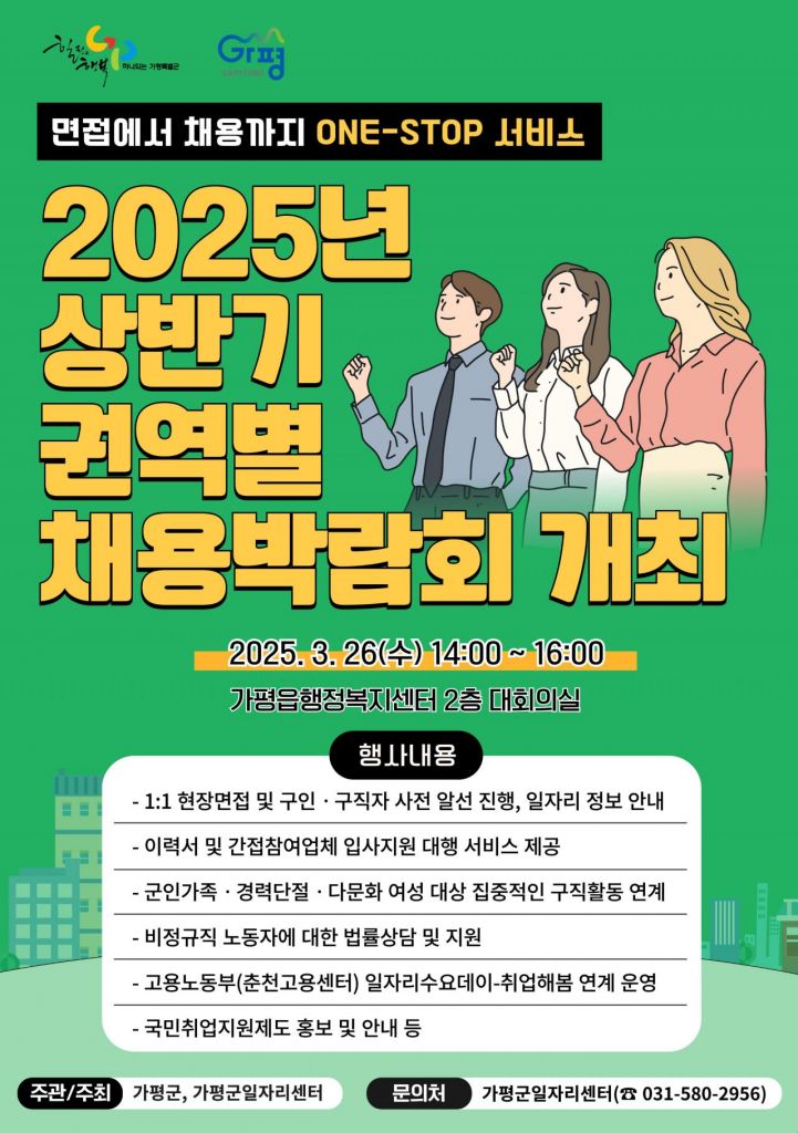 채용박람회는 권역별로 총 3차례 열린다. 26일 가평읍(북면 포함)을 시작으로, 4월 9일 설악면·청평면, 4월 23일 상면·조종면에서 진행된다. 행사에서는 취업 상담, 이력서 작성 지원, 실시간 취업 정보 제공 등이 이루어진다.