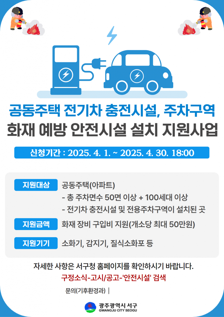 한편, 서구는 동 행정복지센터와 공영주차장 충전소 주변에도 소방시설과 안전용품을 설치하는 등 주민 안전에 주력하고 있다.