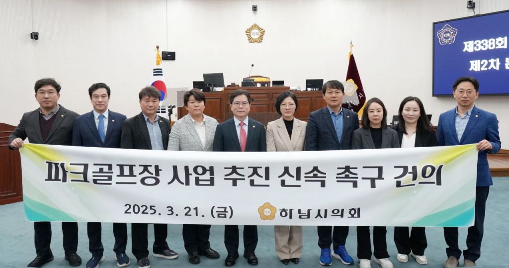 하남시의회는 21일 제338회 임시회 제2차 본회의에서 ‘파크골프장 사업 신속 추진 촉구 건의문’을 채택한 후 기념촬영을 하고 있다. 하남시의회 제공