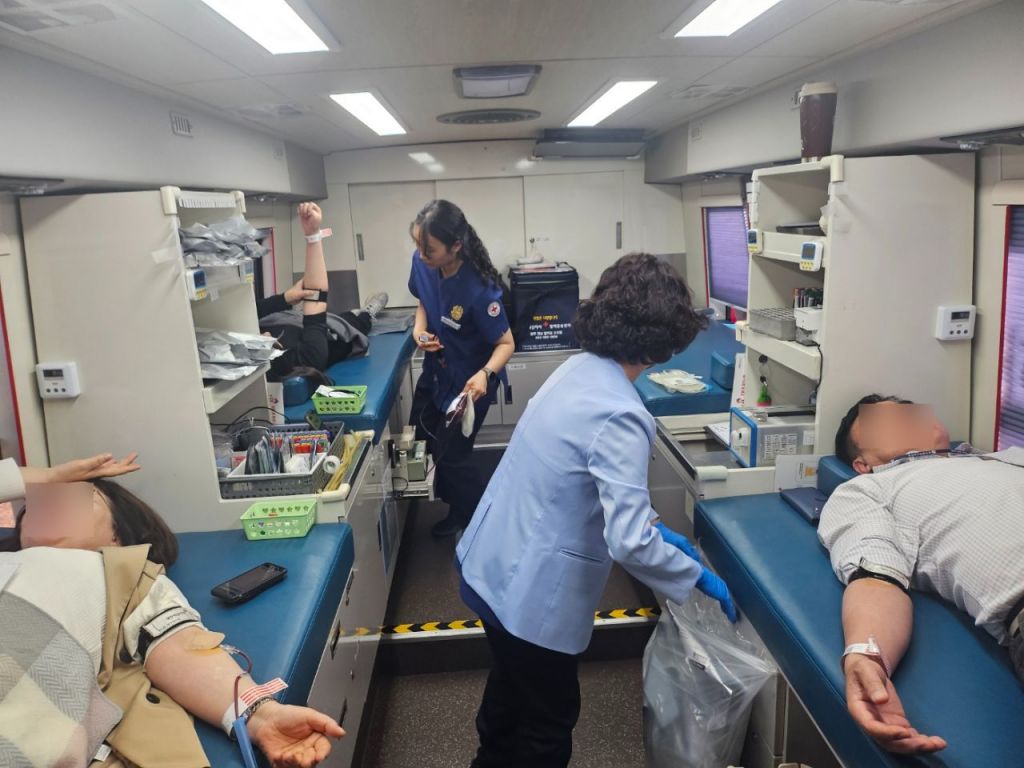 광주교육청이 21일 본청 주차장에서 ‘2025년 사랑의 헌혈 운동’ 캠페인을 열고 헌혈 버스를 운영했다. 이날 본청 직원들이 헌혈에 참여해 생명 나눔을 실천했다. 광주교육청 제공