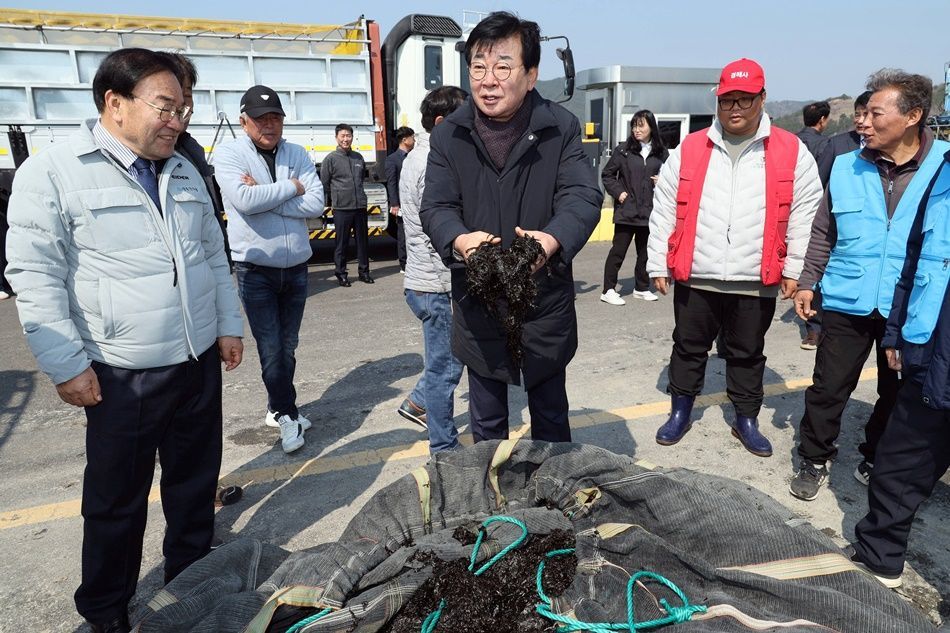 김성 장흥군수가 지난 20일 회진면 대리항 물김 위판 현장을 방문해 어민들과 소통에 나섰다.