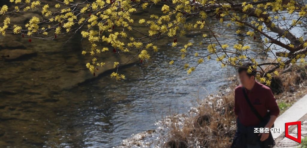 완연한 봄 날씨를 보인 21일 서울 청계천에 활짝 핀 산수유를 보며 시민들이 산책을 즐기고 있다.