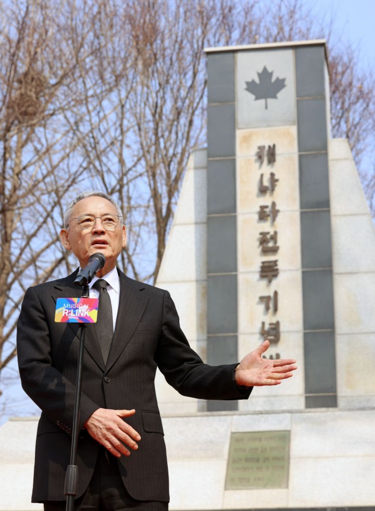 유인촌 문화체육관광부 장관이 21일 경기 가평군 캐나다전투기념비 앞에서 열린 가평 전투 소재 한국-캐나다 공동 창작뮤지컬 ‘링크(R:LINK)’ 제작발표회에서 인사말을 하고 있다. [사진 제공= 문화체육관광부]