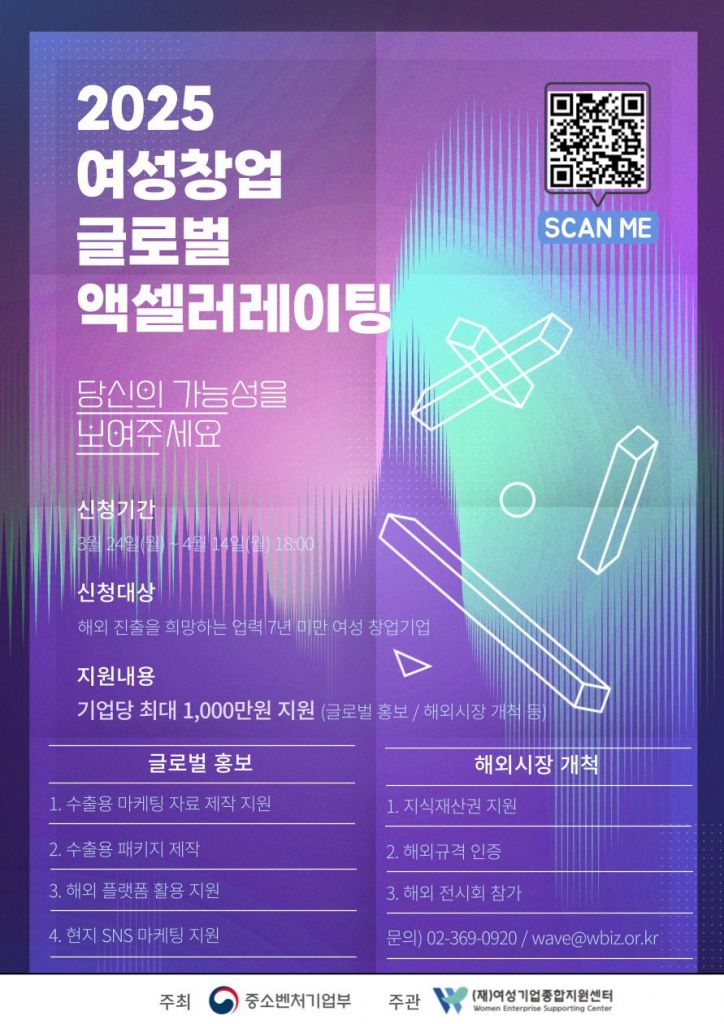 여성기업종합지원센터는 여성 창업기업의 해외시장 진출을 촉진하고 새로운 성장 기회를 제공하기 위해 ‘2025년 여성창업 글로벌 액셀러레이팅’ 참가기업을 모집한다고 24일 밝혔다. 올해부터는 여성창업기업의 수출국 다변화 촉진을 위해 미국, 일본, 중국, 베트남 등 주요 수출국 외 국가로 수출하는 여성창업기업에 선정심사 시 5점의 가점을 부여할 계획이다.