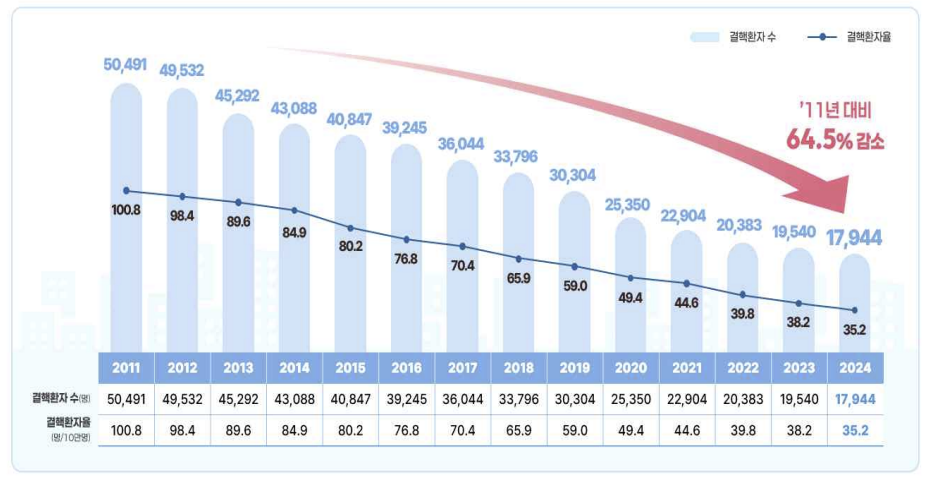 24일 질병관리청에 따르면, 지난해 국내 결핵 환자는 전년 대비 8.2% 감소한 1만7944명이 발생했다. 신규 환자가 1만4412명, 재발·재치료인 경우가 3532명이었다. 인구 10만명당 결핵 환자 수인 결핵환자율은 2023년 38.2명에서 2024년 35.2명으로 감소했다.