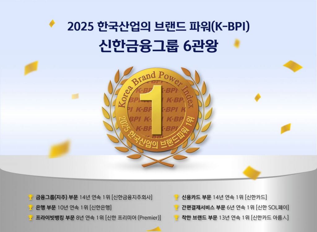 신한금융그룹은 24일 한국능률협회컨설팅(KMAC)에서 주관하는 '2025 한국산업의 브랜드 파워(K-BPI)' 조사에서 신한금융지주, 신한은행, 신한카드가 총 6개 분야에서 1위 브랜드로 선정됐다고 밝혔다.
