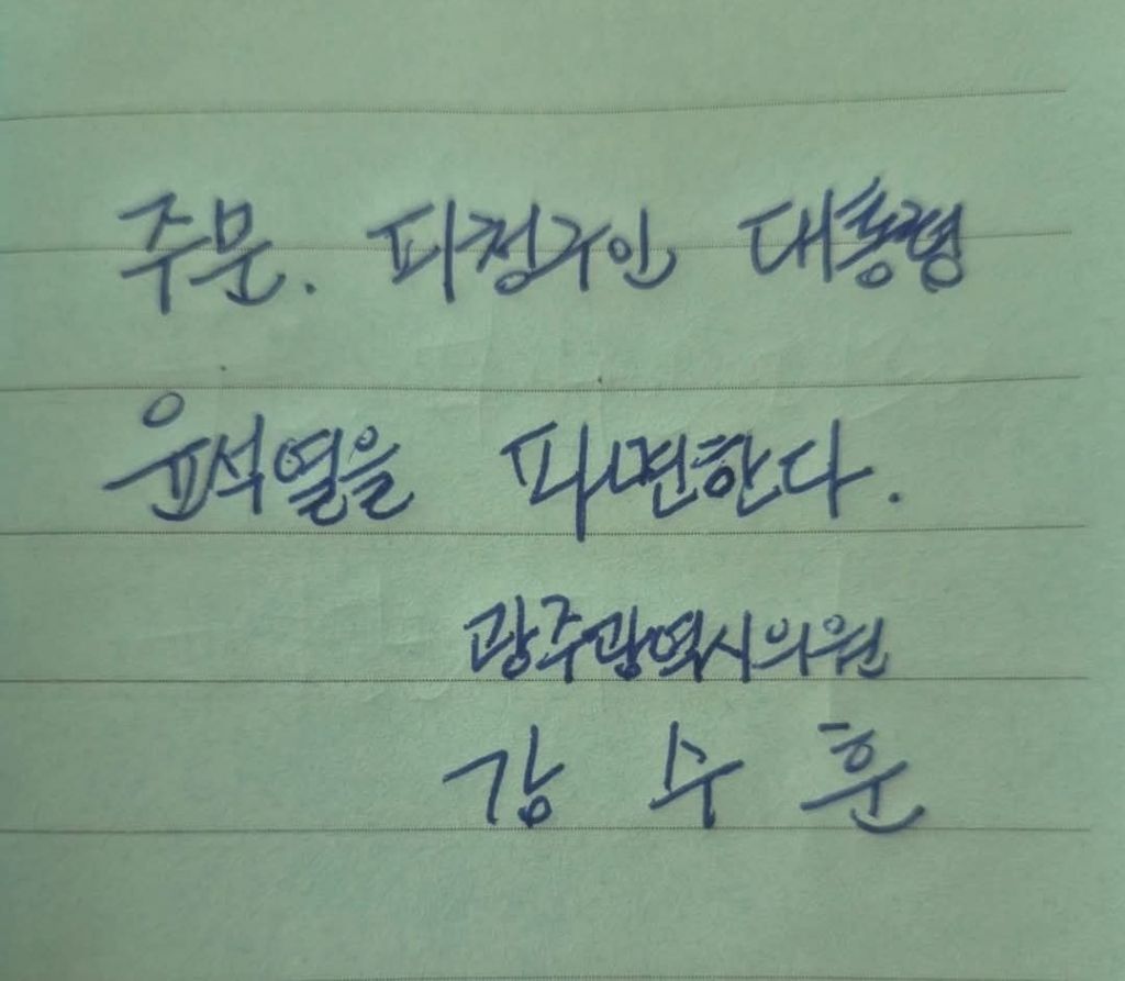 강수훈 광주시의회 의원이 캠페인으로 첫 제안해 SNS에서 확산하고 있는 ‘주문, 피청구인 대통령 윤석열을 파면한다’ 손글씨. 강수훈 광주시의원 제공