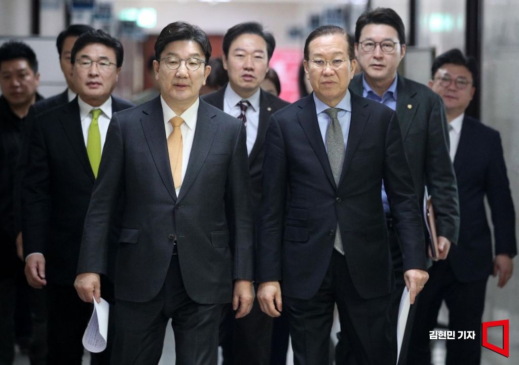 권영세 국민의힘 비상대책위원장과 권성동 원내대표가 24일 국회에서 한덕수 국무총리 탄핵 기각 관련 기자회견을 위해 이동하고 있다. 2025.3.24 김현민 기자