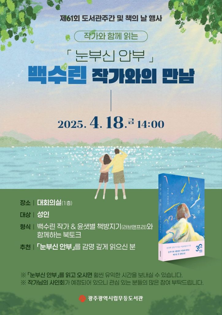 이어 4월 18일에는 무등도서관에서 백수린 작가 초청 강연이 열린다. 백 작가는 이날 무등도서관 1층 대회의실에서 오후 2시부터 2시간가량 저서 ‘눈부신 안부’에 대해 탐구하고 작가로서의 삶에 대해 이야기한다. 백 작가는 지난 2020년 현대문학상과 한국일보 문학상을 수상했다. 주요 저서로는 ‘눈부신 안부’와 ‘여름의 빌라’ 등이 있다.
