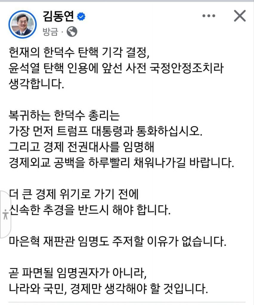 김동연 지사는 이날 자신의 사회관계망서비스(SNS)에 올린 글에서 "헌재의 한덕수 탄핵 기각 결정, 윤석열 탄핵 인용에 앞선 사전 국정안정 조치라 생각한다"며 "복귀하는 한덕수 총리는 가장 먼저 트럼프 대통령과 통화해야 한다"고 말했다.