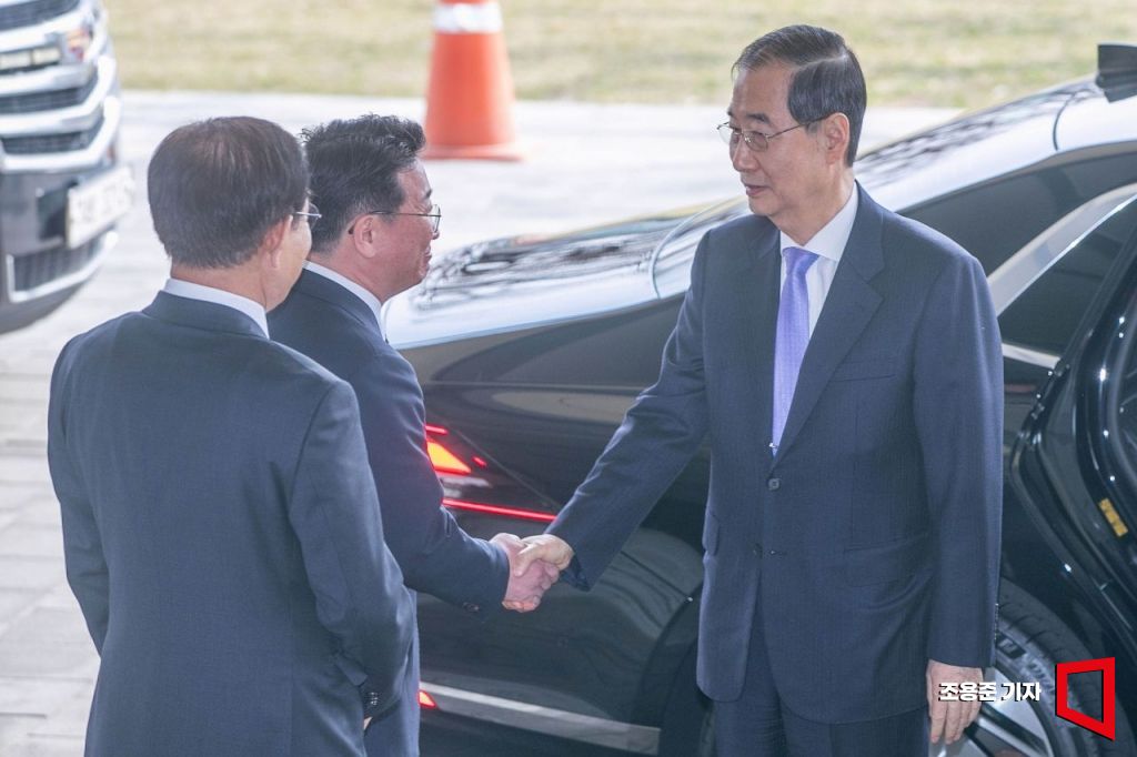 헌법재판소가 한덕수 국무총리에 대한 국회의 탄핵소추를 기각한 24일 한 총리가 정부서울청사로 87일만에 직무에 복귀하며 국무조정실 국무 1차장과 악수를 하고 있다.