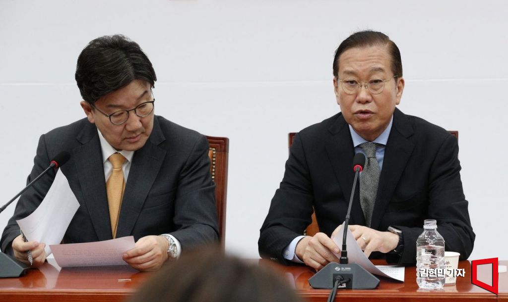권영세 국민의힘 비상대책위원장과 권성동 원내대표가 24일 국회에서 한덕수 국무총리 탄핵 기각 관련 기자회견을 하고 있다.