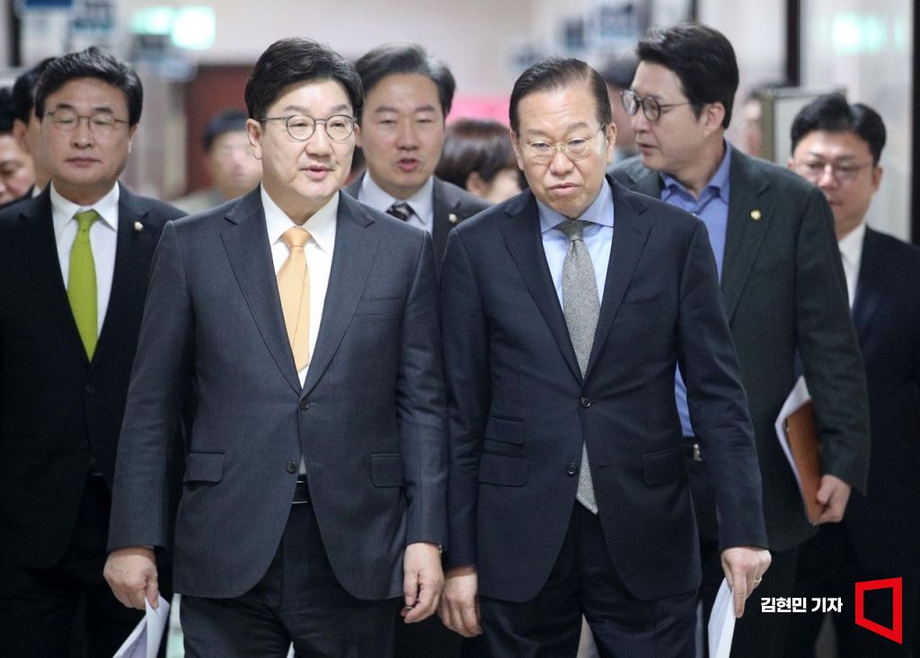 권영세 국민의힘 비상대책위원장과 권성동 원내대표가 24일 국회에서 한덕수 국무총리 탄핵 기각 관련 기자회견을 위해 이동하고 있다.