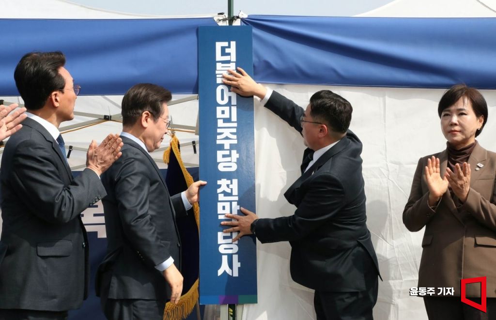 이재명 더불어민주당 대표와 박찬대 원내대표가 24일 서울 광화문에서 천막당사 현판식을 갖고 있다.