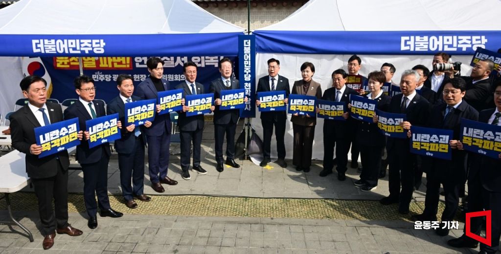이재명 더불어민주당 대표와 박찬대 원내대표 등 최고위원들이 24일 서울 광화문에 설치된 천막당사에서 최고위원회의를 갖고 있다.